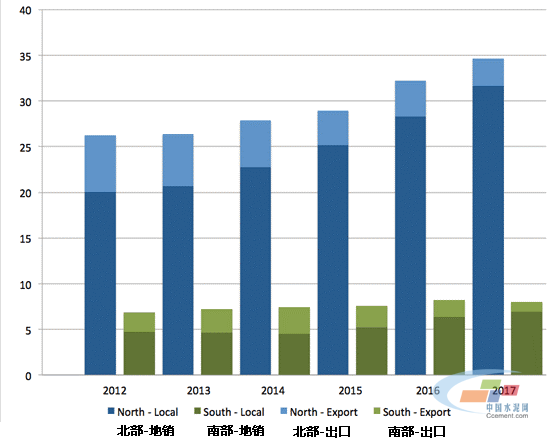 上圖展現(xiàn)了巴基斯坦國內(nèi)水泥行業(yè)的現(xiàn)狀,巴基斯坦的年度水泥消費(fèi)量從2012年的3310萬噸增長到了2017年的4280萬噸,增長幅度在30%左右,其中五分之四的水泥消費(fèi)集中在巴基斯坦的北部地區(qū)。與此同時(shí),更重要的是,巴基斯坦的出口水泥從2013年的830萬噸降低到了2017年的420萬噸。造成這一現(xiàn)象的主要原因是阿富汗市場(chǎng)的下跌,以及水性熟料出口量的減少??紤]到南方市場(chǎng)的出口水泥比例較高,盡管水泥總消費(fèi)量在增長,但是出口量的減少對(duì)南方可能會(huì)造成更大的打擊。2018年到目前為止,類似的趨勢(shì)依然存在,唯一有所改變的是南方熟料出口量的在今年有反彈的跡象。