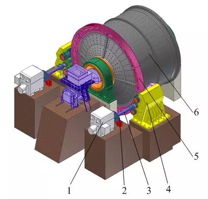 1. 同步電動(dòng)機(jī) 2. 制動(dòng)器 3. 力矩限制聯(lián)軸器 4. 多點(diǎn)嚙合減速器 5. 齒圈 6. 磨機(jī)本體