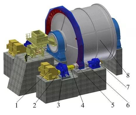 1. 異步電動(dòng)機(jī) 2. 高速聯(lián)軸器 3. 雙輸入行星減速器 4. 齒式聯(lián)軸器 5. 開式齒輪軸組 6. 齒圈 7. 慢速驅(qū)動(dòng)裝置 8. 磨機(jī)本體