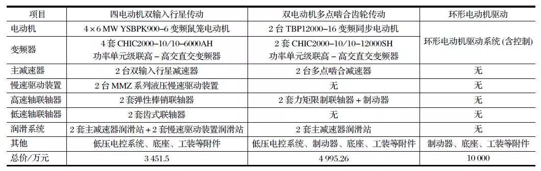 表 2 φ12.2 m×8.8 m 半自磨機(jī)驅(qū)動(dòng)方案配置及造價(jià)對比