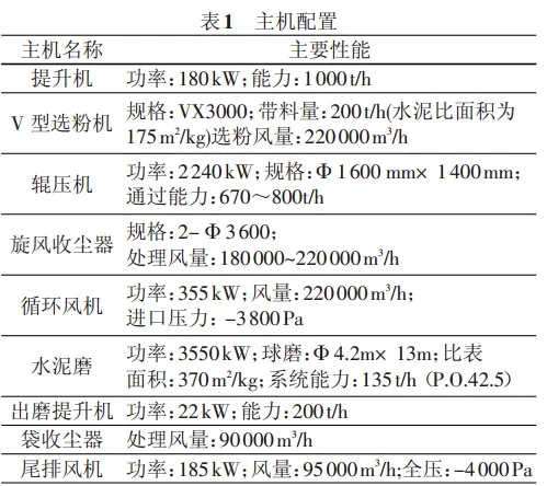 此系統(tǒng)主要由 V 型選粉機、輥壓機、旋風(fēng)收塵器和球磨機組成。球磨機系統(tǒng)為開流系統(tǒng),輥壓機系統(tǒng)放風(fēng)與球磨機通風(fēng)共用一套收塵系統(tǒng)。流程見圖1,主機配置見表 1。