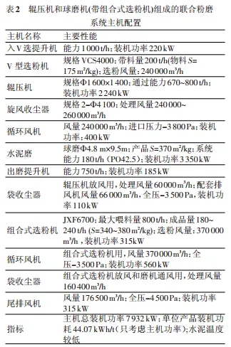 此系統(tǒng)主要由 V 型選粉機、輥壓機、旋風(fēng)收塵器、球磨機和組合式選粉機組成,球磨機系統(tǒng)為閉路系統(tǒng),流程圖見圖 3,主要的主機配置見表 2。其中輥壓機系統(tǒng)設(shè)有單獨放風(fēng)系統(tǒng),球磨機單獨通風(fēng)與組合式選粉機放風(fēng)共用一套收塵系統(tǒng)。