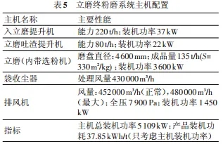 此系統(tǒng)主要由立磨、高濃度袋收塵器和風(fēng)機組成,流程圖見圖 6,主要的主機配置見表 5。此系統(tǒng)其特點是:流程簡單,系統(tǒng)電耗低;廠房占地少,立磨又可以露天布置,因此土建費用相對較少;另外立磨的維修量比輥壓機要少,所以運轉(zhuǎn)率較輥壓機系統(tǒng)高。
