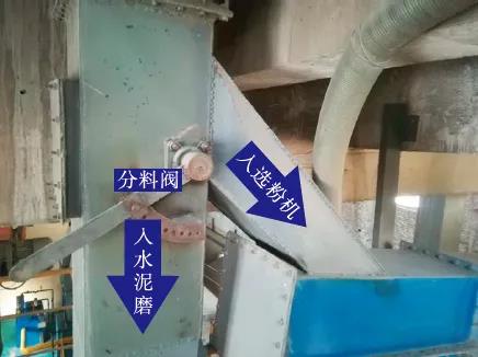 圖3 兩路分料閥3 試驗(yàn)步驟(1)在設(shè)備運(yùn)行穩(wěn)定、產(chǎn)質(zhì)量正常情況下,出V型選粉機(jī)微粉全部入磨機(jī),即以聯(lián)合粉磨方式為基準(zhǔn),簡(jiǎn)稱(chēng)為試驗(yàn)1;