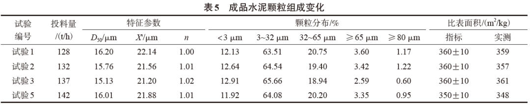關(guān)閉和開(kāi)啟不同格數(shù)的分料閥進(jìn)行生產(chǎn),分別標(biāo)定磨機(jī)產(chǎn)量,并對(duì)粉磨過(guò)程中各點(diǎn)物料進(jìn)行取樣,測(cè)定物料顆粒組成及物理性能、與外加劑相容性。然后對(duì)加工過(guò)程中各點(diǎn)物料粒度變化情況進(jìn)行比較后進(jìn)行質(zhì)量指標(biāo)的調(diào)整(試驗(yàn)5)。