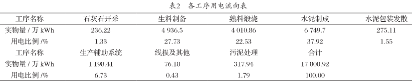 水泥企業(yè)電力消耗主要是設(shè)備動(dòng)力拖動(dòng),一部分由社會(huì)電網(wǎng)提供,另外一部分由企業(yè)余熱發(fā)電廠提供。2018年企業(yè)外購(gòu)電力13 688.15 萬kWh,余熱自發(fā)電4 112.77 萬kWh,合計(jì)17 800.92 萬kWh全部用于水泥生產(chǎn)。各工序用電流向如表2所示。
