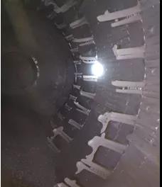 由于物料在進(jìn)入磨機(jī)前經(jīng)過(guò)了輥壓機(jī)和 V 型選粉機(jī),粒度較細(xì),研磨體直徑較小,因此,筒體襯板均采用超薄襯板,既降低了襯板質(zhì)量,又增加了筒體有效內(nèi)徑,在填充率一定的情況下,料面降低,可以增大隔倉(cāng)裝置的中心環(huán),進(jìn)而改善磨內(nèi)通風(fēng)。