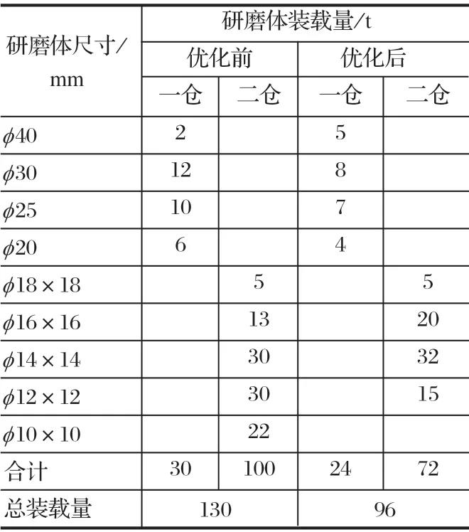 由于對(duì)磨內(nèi)襯板、隔倉(cāng)裝置和出料篦板進(jìn)行了優(yōu)化,使得研磨效率提高,因而可適當(dāng)減少研磨體填充量,將一倉(cāng)和二倉(cāng)的填充率由 28% 降至 22%,降低了磨機(jī)負(fù)荷,進(jìn)而降低了電耗。優(yōu)化前后研磨體級(jí)配如表 1 所列。