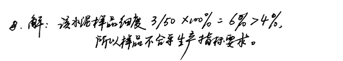 8、某廠水泥樣品50g,經(jīng)0.08mm方孔篩篩析,達(dá)到規(guī)定時(shí)間所剩料量為3g,問該樣品是否合乎生產(chǎn)指標(biāo)要求?(要求水泥細(xì)度<4%)