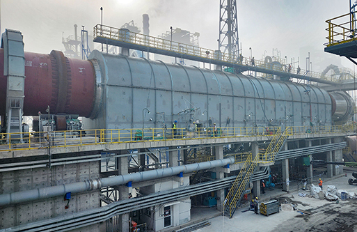 轉(zhuǎn)化焙燒:鋰輝石精礦從精礦庫(kù)人工送至斗式提升機(jī)提升至精礦倉(cāng),再經(jīng)圓盤給料機(jī)和螺旋給料機(jī)加入碳酸鋰回轉(zhuǎn)窯窯尾,利用窯尾預(yù)熱段高溫氣體干燥精礦,精礦在煅燒段約1200℃左右的溫度下進(jìn)行晶型轉(zhuǎn)化焙燒,由α型(單斜晶系,密度3150kg/m3)轉(zhuǎn)化為β型鋰輝石(四方晶系,密度2400kg/m3,即焙料),轉(zhuǎn)化率約98%。